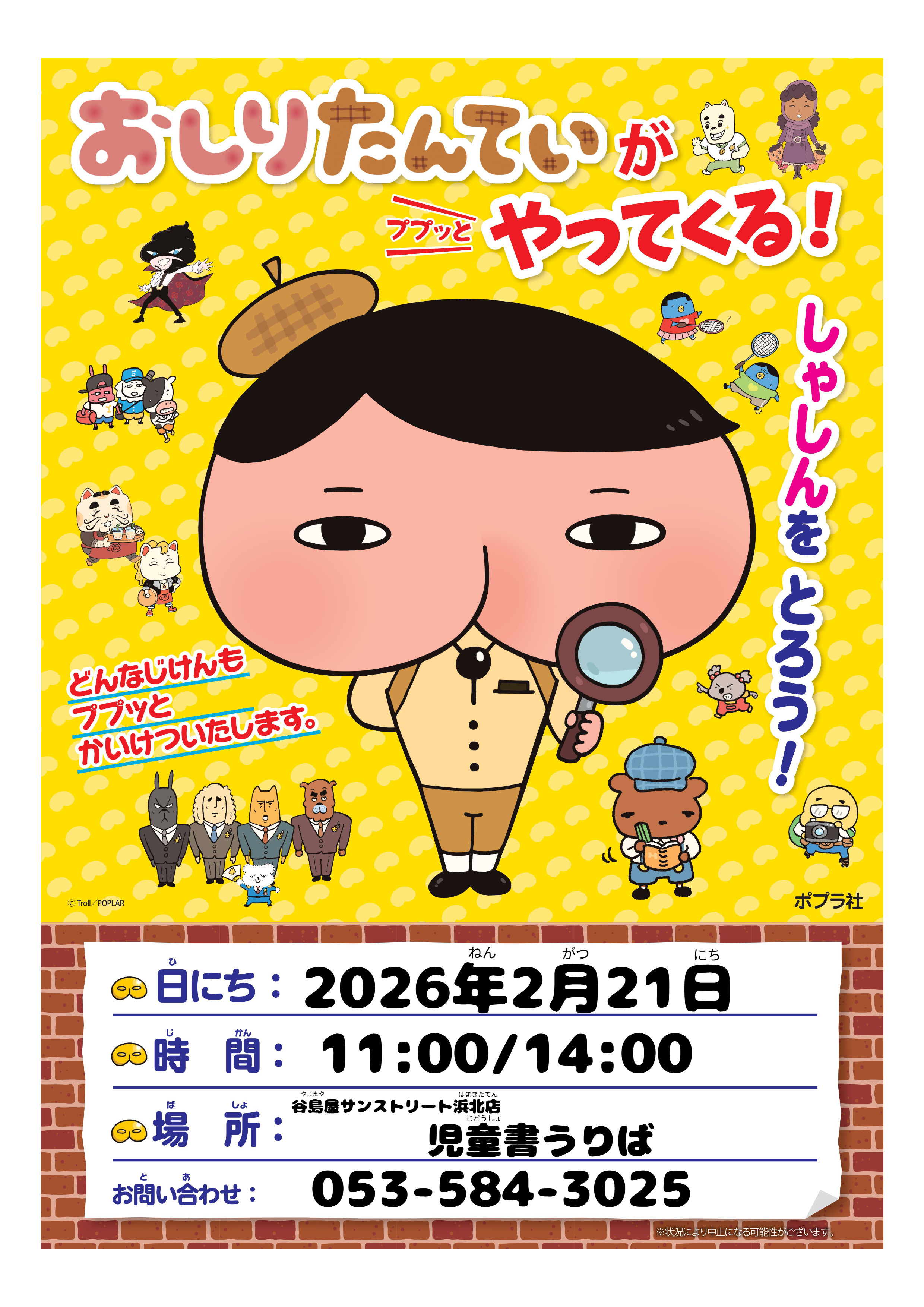 サンストリート浜北店・児童書売場:「おしりたんてい撮影会」26年2月21日(土)1部11:00~、2部14:00~